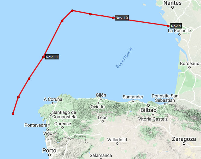 Steve is celebrating his 36th birthday alone at sea today by eating his first meal since leaving France. Yesterday was brutal with all his attention being on ensuring the boat survived the Bay of Biscay pounding. Three of his competitors were dismasted in the furious weather. He is celebrating today in calmer weather in 20 knots of wind with 15 to 18 knots of boat speed.