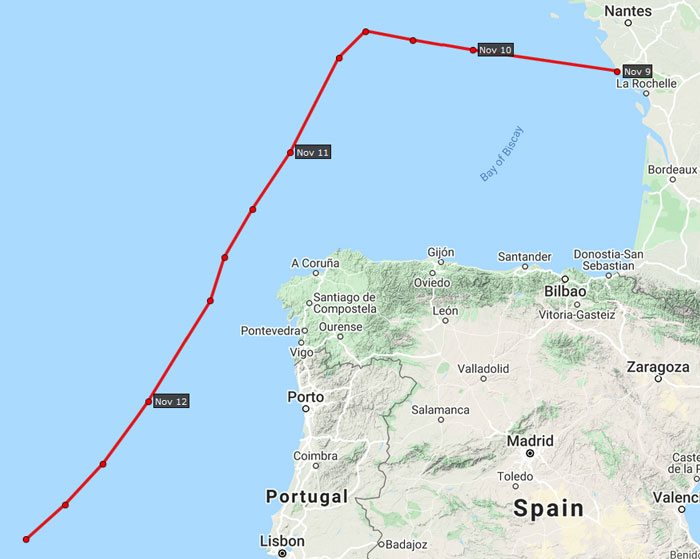 On the first night the exhaust blew off the generator four times which filled the boat with diesel fumes and water, and then a pin fell into the battery box and shorted out between the live terminal and the carbon of the boat, and caused a small fire, and so filled the boat with burning epoxy, smell and had a bit of a diesel leak, and I had quite a lot of water in the boat as well, and there was an awful lot of unsecured gear flapping around so I did not really have a very good time for the first 24 hours. I am getting there slowly, but if I can fix the keyboard then I can start turning some blogs, and I am just trying to take it easy on my elbow really, I have some problems with it, and I have a hideous cold, but other than that I am quite fine really, the sun is shining and I have my new spinnaker up, and so I am quite happy really."