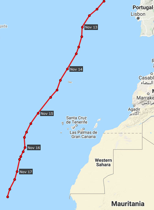 It's like an oven here today, We have complete unbroken cloud cover and it is very hot and humid indeed, although I suspect it will get more so as we are a way off the equator at the moment. I am further south than I have ever been I think, having just passed the latitude of the Bahamas. That's the thing with sailing, point the boat in one direction for a few days, and you finish up in a completely different world - if I had some good (very good) binoculars I could see Cuba to my right, and lions and such like to my left which is incredible if you think about it, we only left home a week ago. Somehow I don't expect this when I go sailing, it's not like flying where it is never a surprise to disembark in a foreign and different country; but when you step ashore in a new country from a boat, you feel so much more like you've earned the right to be there - not that I'm planning to get off for anything or anybody until I get back to les Sables in February! I am just building up a bigger list of potential holiday destinations.
