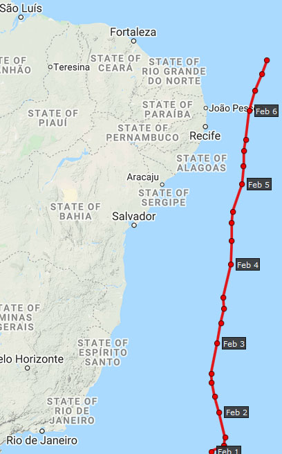 There are lots of fishermen around here too, all heading east away from Brazil and gabbling constantly on channel 16 on the VHF - if there was an emergency you'd never get a word in edgeways! Talking to Brian I think they are after tuna, which they catch with simple rods with a fixed line on the end that stick out of rod holders all down he sides of the boat. I have seen them often off the coast of Portugal, usually doing nothing, but I did see one once that had got lucky; as the ship lay a-hull they were pulling in big tuna one after another, some of them nearly four feet long! There are evidently enough of some sort of creature out here to keep a lot of fishermen busy anyway. Their boats are interesting - no AIS* even though some are quite large, and they are always appauling radar targets, often they have to be within four miles before my radar alarm goes off. The first one I saw was on a converging course with me - he showed up at under four miles on the radar on a collision course doing about ten knots and I couldn't see his port or starboard lights. I called him by VHF and he altered for me instantly but without answering, and as he passed about half a mile away down my port side I could see he had no navigation lights, only running lights, and after three miles I couldn't see his lights or see him properly on the radar and I wondered if he was smuggling something. There are loads of vessels to be bought from the Customs auction in Gibralter that have been confiscated for smuggling, there are two that I know of in Weymouth alone so it must be common, but we shall never know. Also, Santos is a place they warn you about because of piracy, so all in all I am glad to finally in the eleventh hour get the South East Trades this morning for the run up to the Equator and to be leaving Brazil behind me.